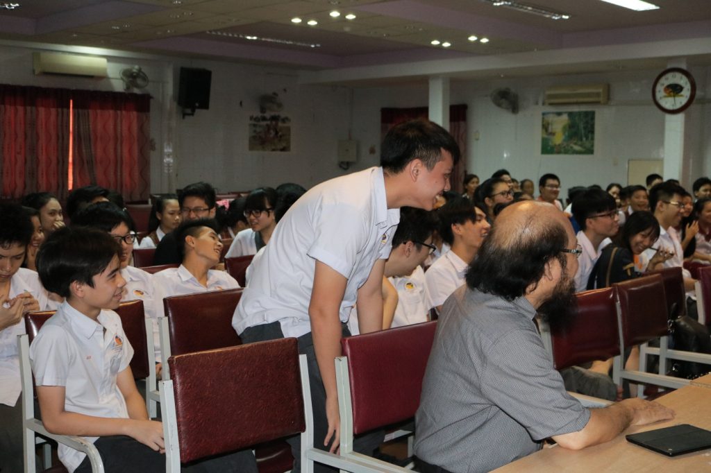 Buổi chiều, các em lại cùng nhau tập trung tại hội trường và tham gia giao lưu, trò chuyện cùng thầy Trần Trung Quang, chủ nhiệm câu lạc bộ MC nhà văn hóa thanh niên với những kiến thức bổ ích về nghệ thuật nói trước công chúng, một trong những kỹ năng vô cùng quan trọng để thành công trong tương lai. Bằng những câu chuyện thú vị, dí dỏm nhưng không kém phần sâu sắc. Thầy đã mang đến cho các em học sinh một buổi giao lưu thật ý nghĩa, đã dạy các em những cách để có thể tự tin hơn, cách xử lý những tình huống trên sân khấu cũng như truyền cho các em nhiệt huyết cũng như ngọn lửa đam mê đối với môn nghệ thuật này.